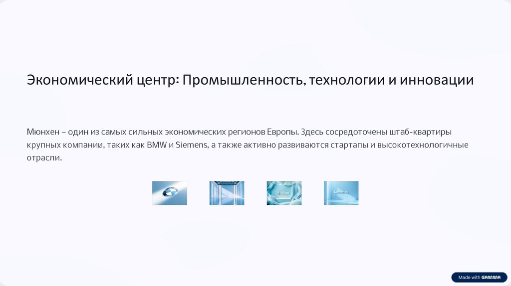 Экономический центр: Промышленность, технологии и инновацииМюнхен — один из самых сильных экономических регионов Европы. Здесь сосредоточены штаб-квартиры