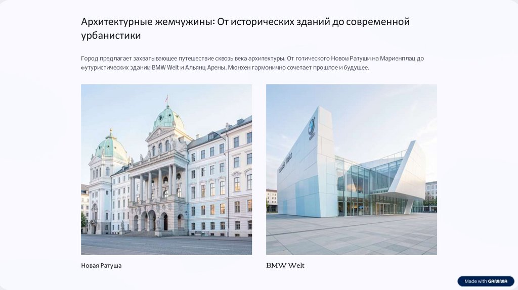 Город предлагает захватывающее путешествие сквозь века архитектуры. От готического Новой Ратуши на Мариенплац до