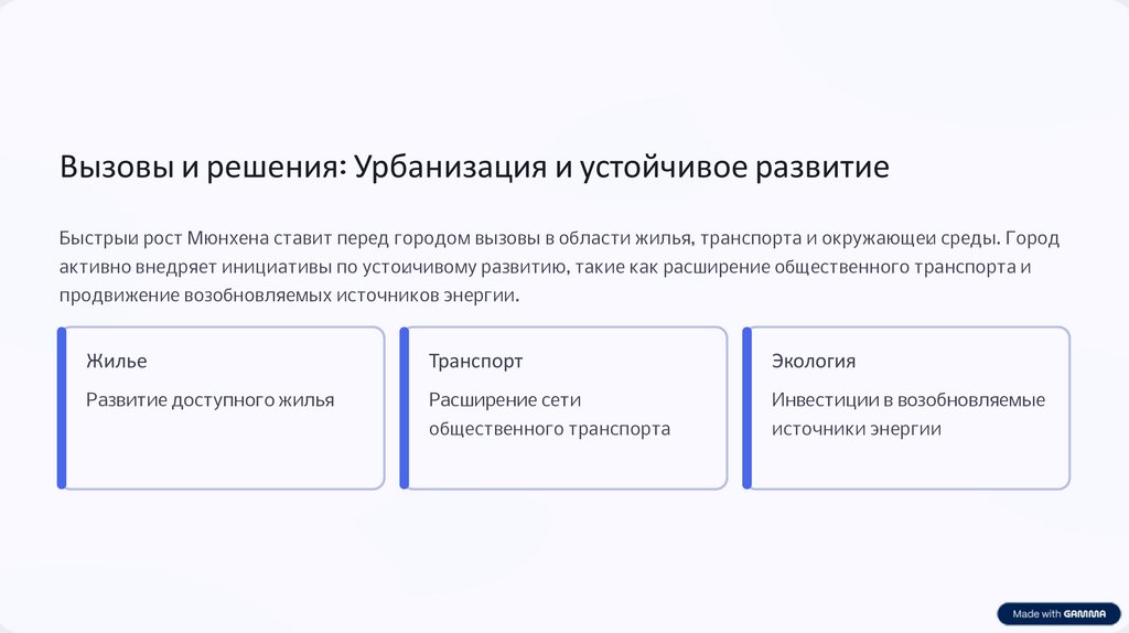 Вызовы и решения: Урбанизация и устойчивое развитиеБыстрый рост Мюнхена ставит перед городом вызовы в области жилья, транспорта и окружающей среды. Город