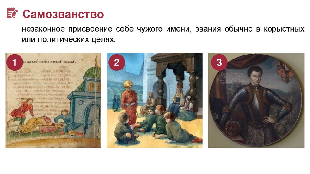 Самозванствонезаконное присвоение себе чужого имени, звания обычно в корыстных