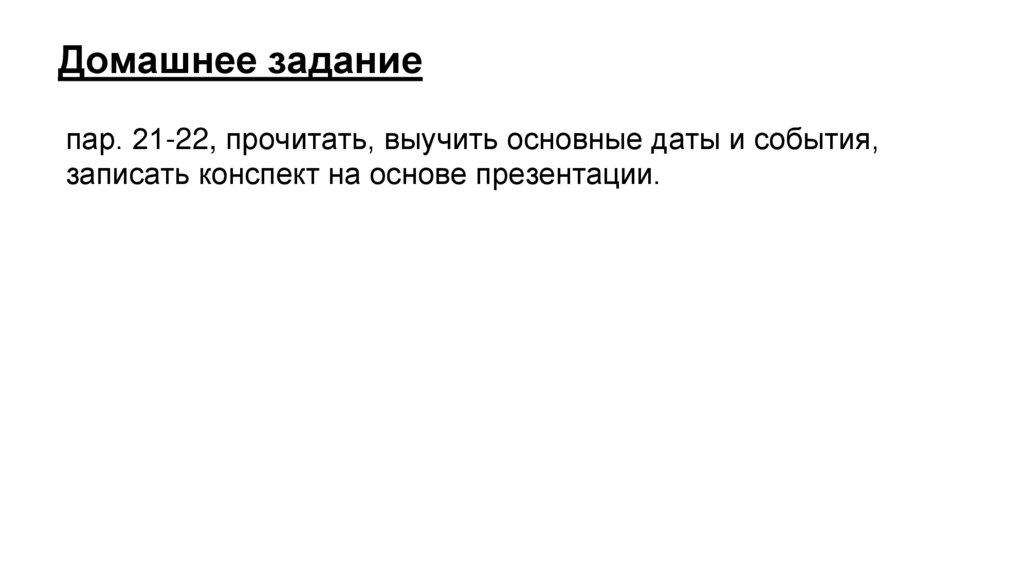 Домашнее заданиепар. 21-22, прочитать, выучить основные даты и события,
