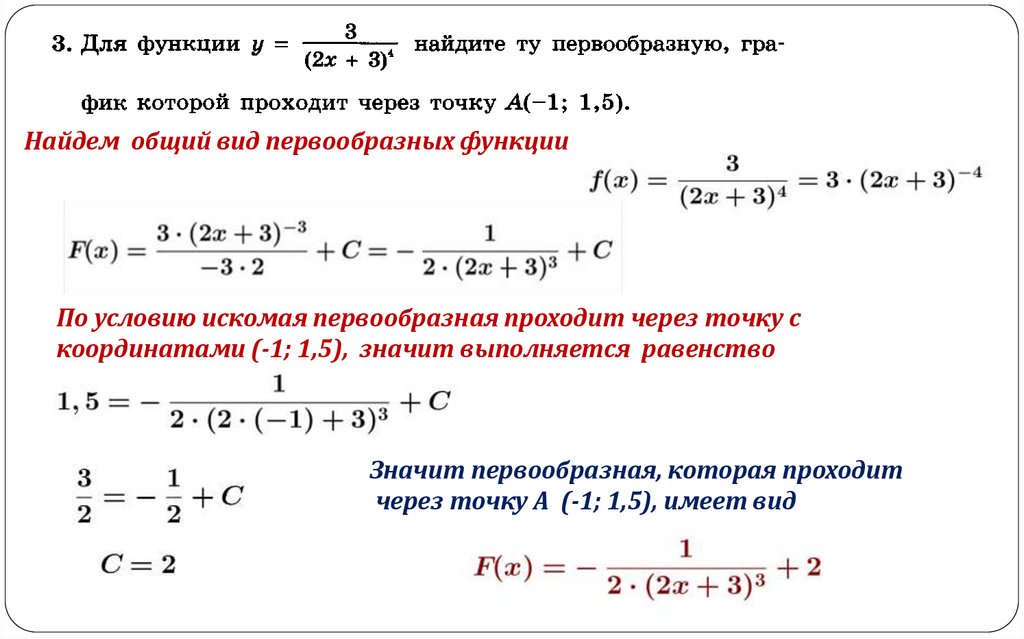 Найдем общий вид первообразных функцииПо условию искомая первообразная проходит через точку с