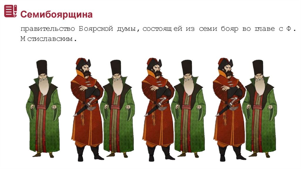 Семибоярщинаправительство Боярской думы , состоящ ей из семи бояр во главе с Ф .