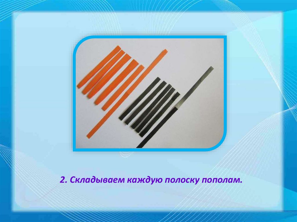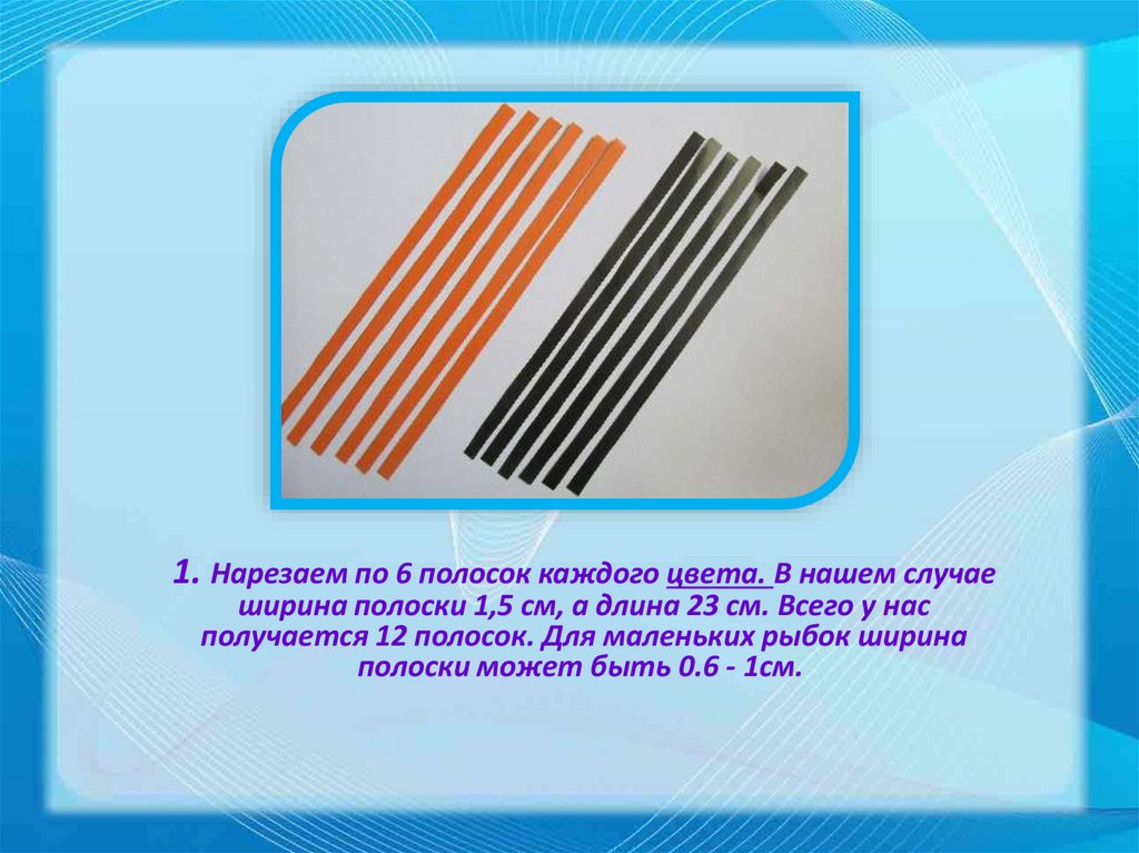 1. Нарезаем по 6 полосок каждого цвета. В нашем случаеширина полоски 1,5 см, а длина 23 см. Всего у нас