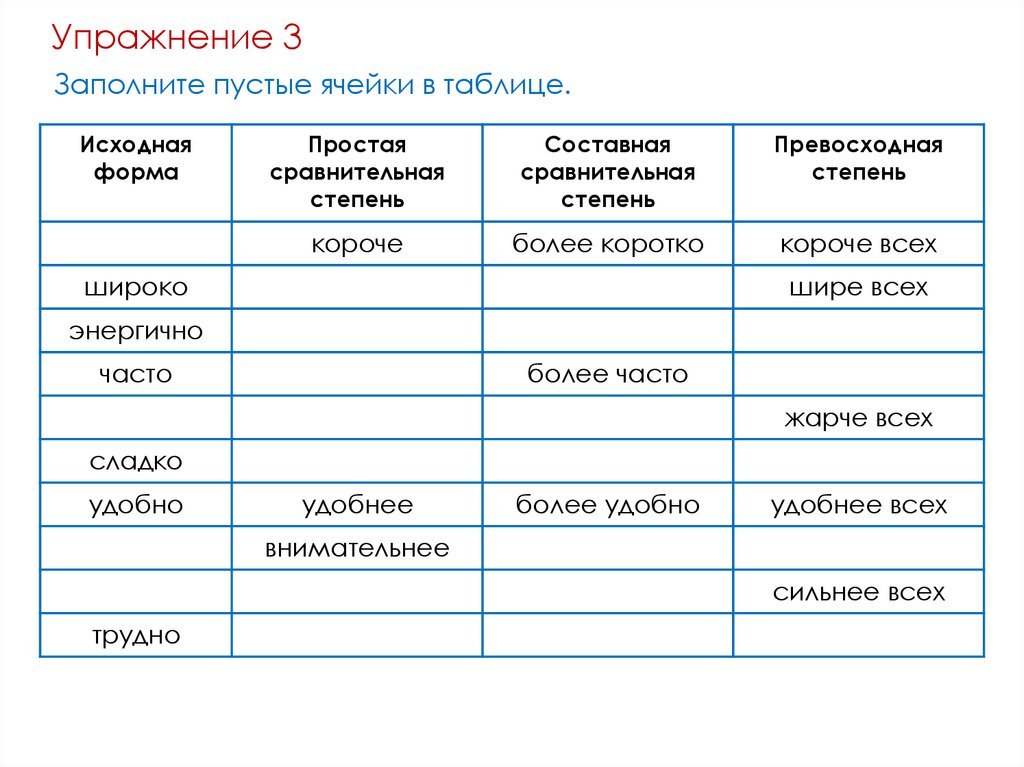 Упражнение 3Заполните пустые ячейки в таблице.