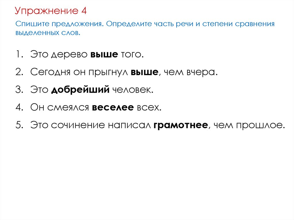 Упражнение 4Спишите предложения. Определите часть речи и степени сравнения