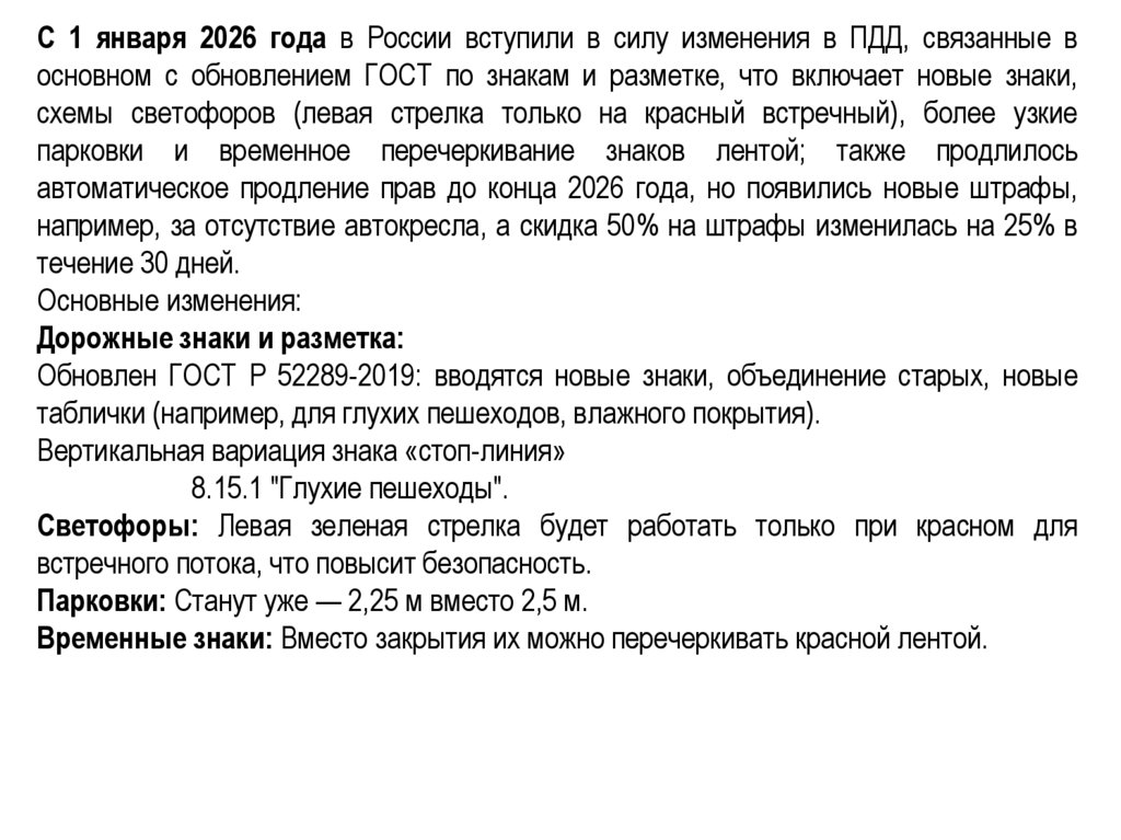 С 1 января 2026 года в России вступили в силу изменения в ПДД, связанные восновном с обновлением ГОСТ по знакам и разметке, что включает новые знаки,