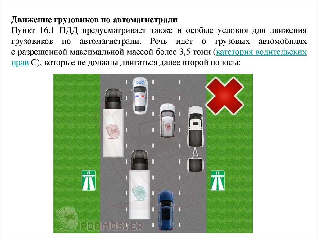 Движение грузовиков по автомагистралиПункт 16.1 ПДД предусматривает также и особые условия для движения