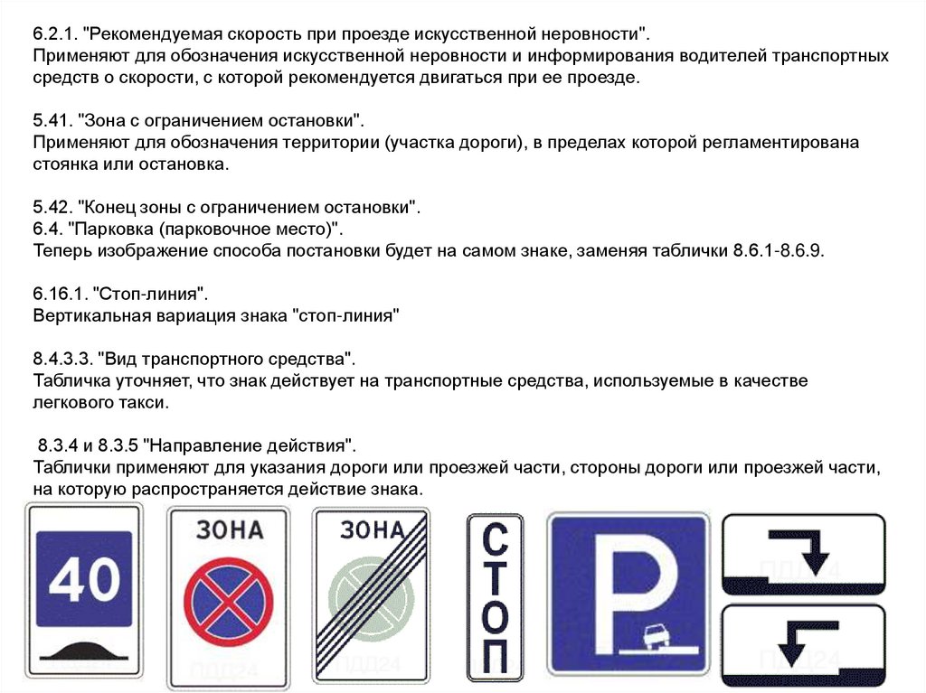 6.2.1. "Рекомендуемая скорость при проезде искусственной неровности".Применяют для обозначения искусственной неровности и информирования водителей транспортных