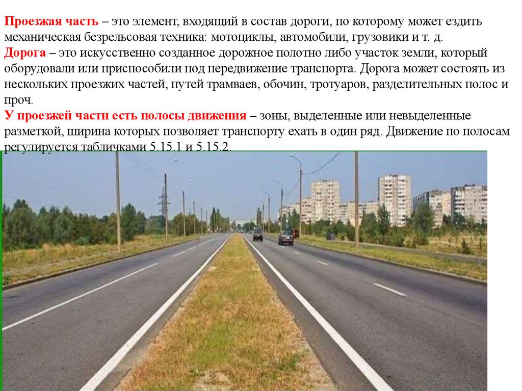 49. « Проезжая часть» - элемент дороги, предназначенный для движения безрельсовых транспортных средств.