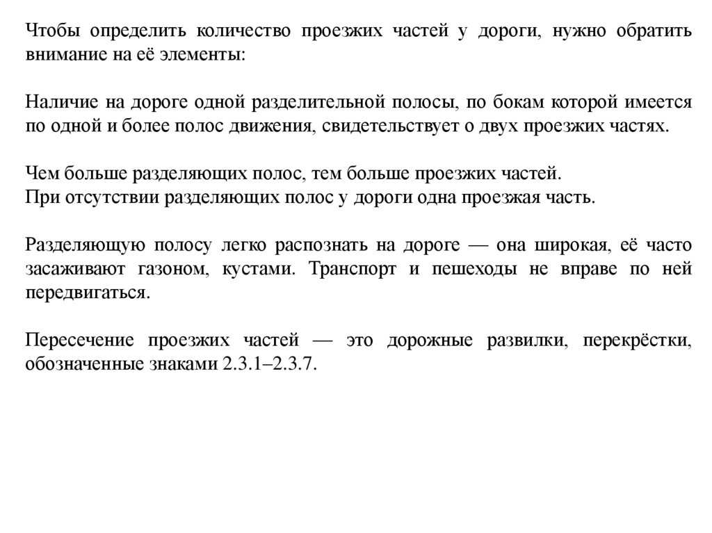 Чтобы определить количество проезжих частей у дороги, нужно обратитьвнимание на её элементы: