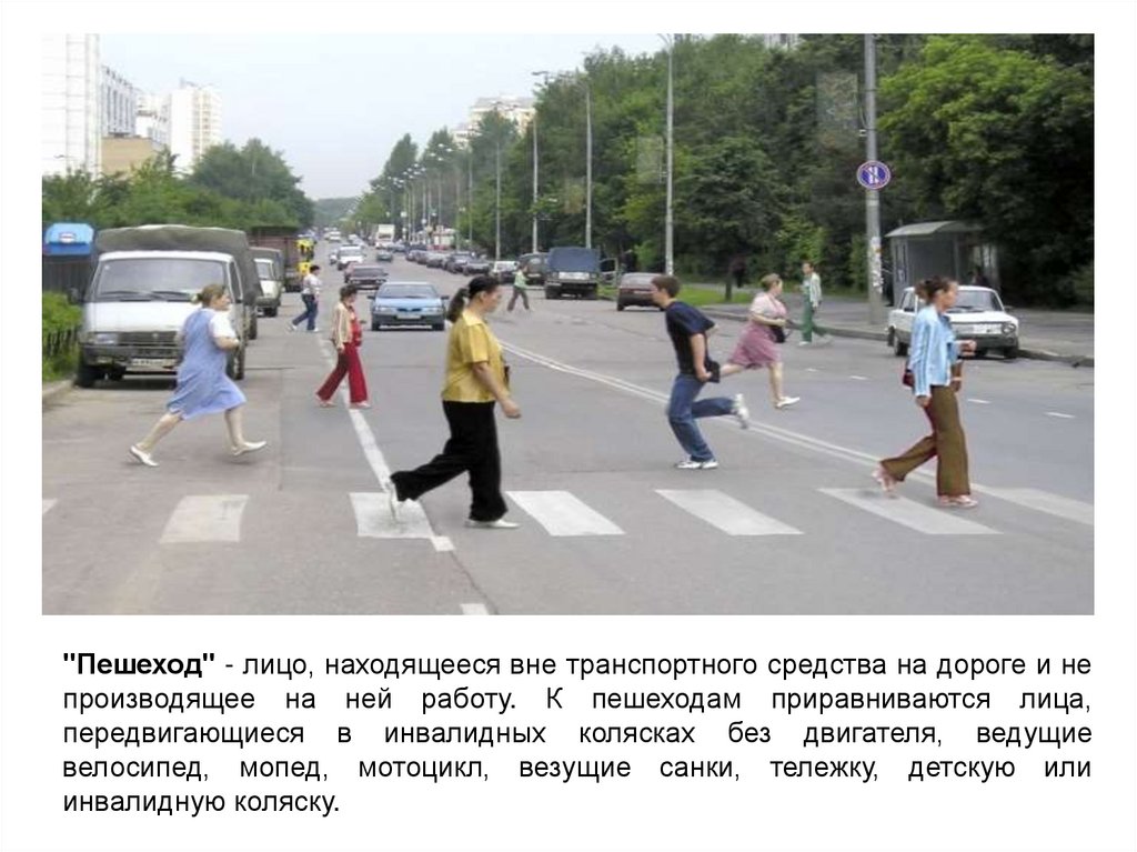 "Пешеход" - лицо, находящееся вне транспортного средства на дороге и непроизводящее на ней работу. К пешеходам приравниваются лица,