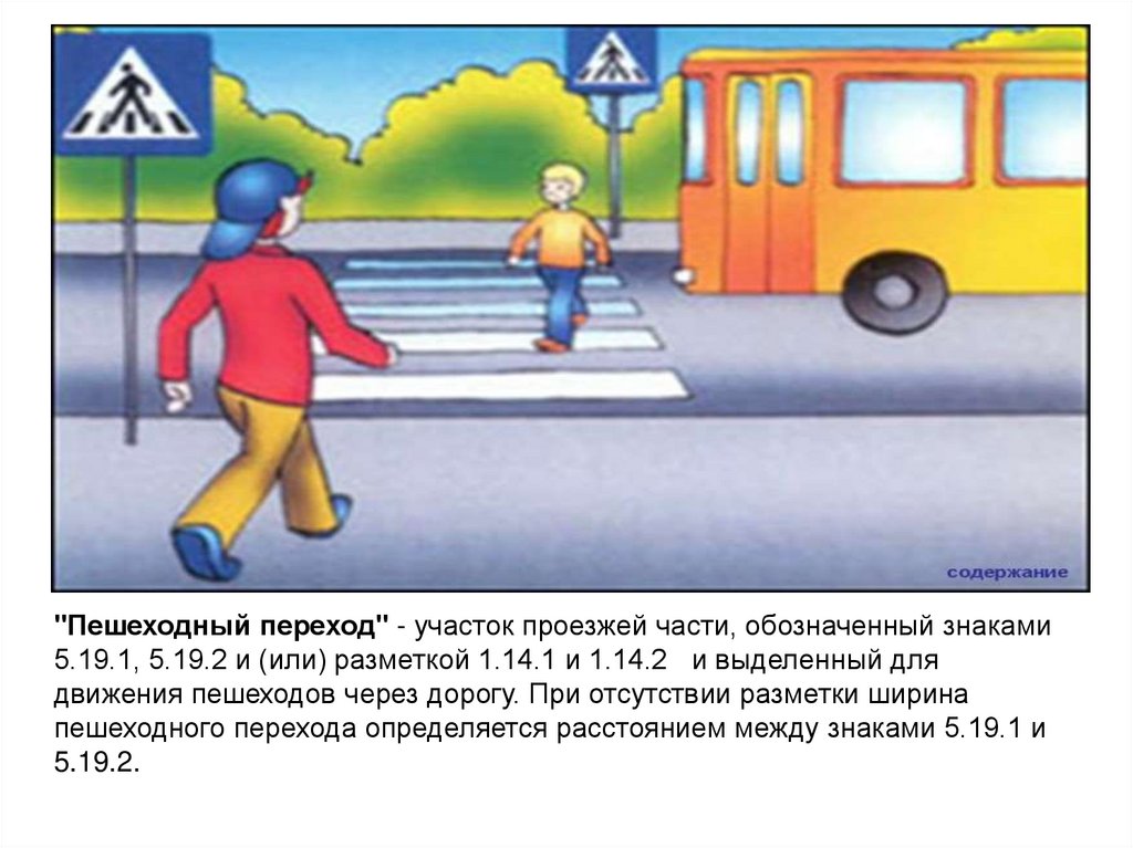 "Пешеходный переход" - участок проезжей части, обозначенный знаками5.19.1, 5.19.2 и (или) разметкой 1.14.1 и 1.14.2 и выделенный для