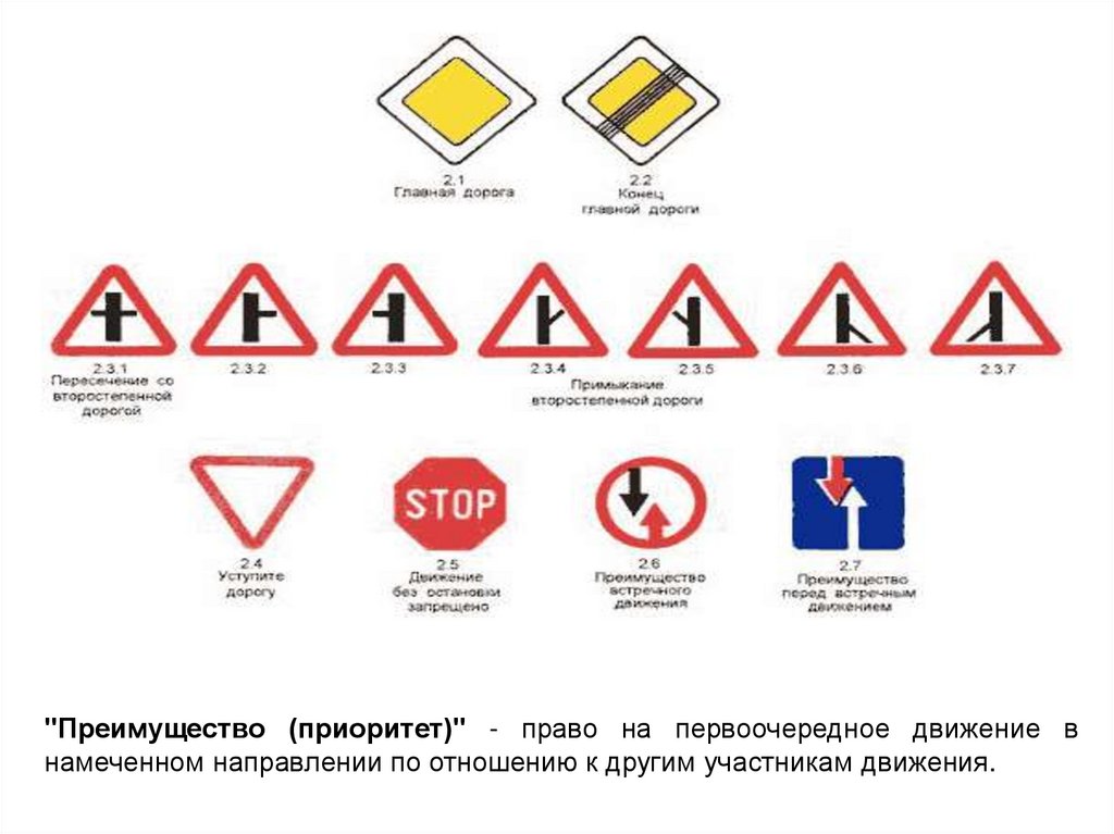 "Преимущество (приоритет)" - право на первоочередное движение внамеченном направлении по отношению к другим участникам движения.