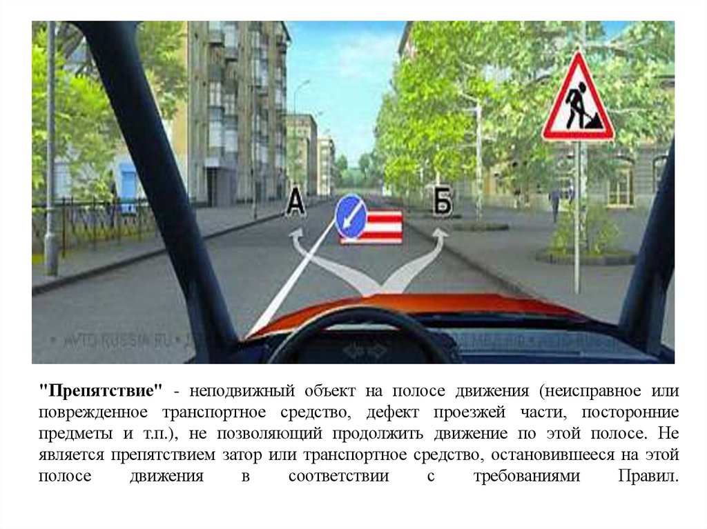 "Препятствие" - неподвижный объект на полосе движения (неисправное илиповрежденное транспортное средство, дефект проезжей части, посторонние
