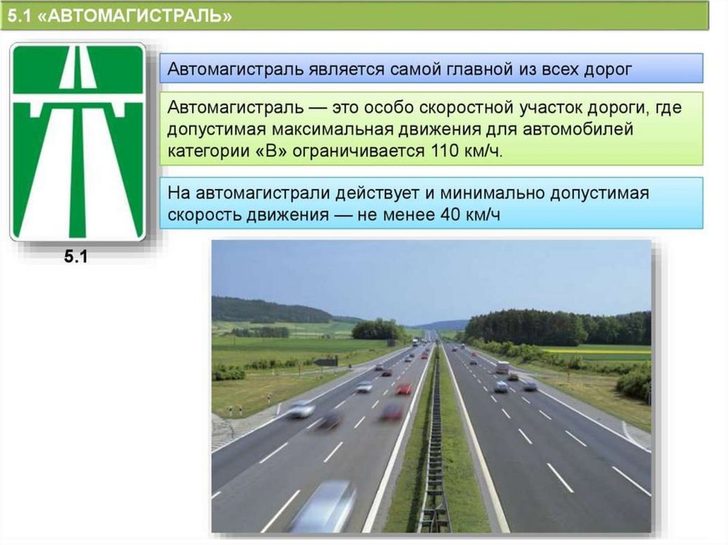 "Автомагистраль" - дорога, обозначенная знаком 5.1 и имеющая для каждогонаправления движения проезжие части, отделенные друг от друга разделительной