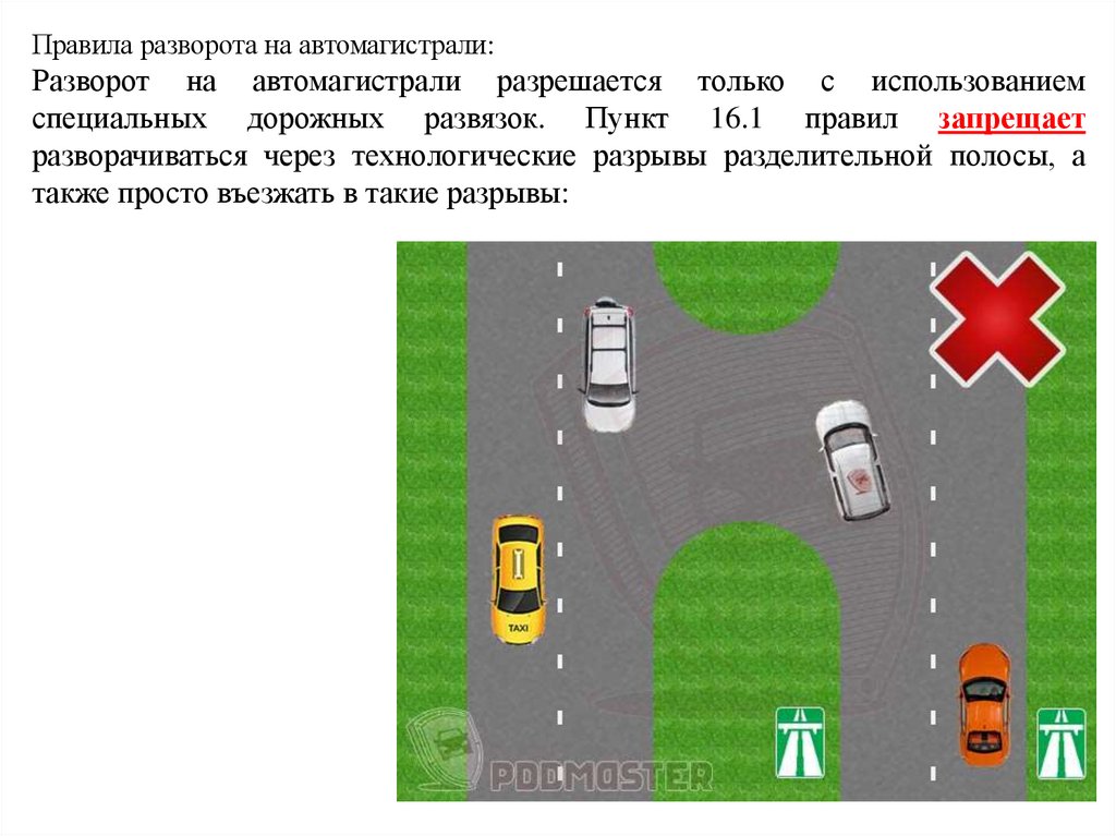 Правила разворота на автомагистрали:Разворот на автомагистрали разрешается только с использованием