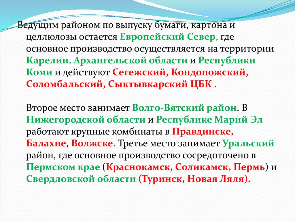 Ведущим районом по выпуску бумаги, картона ицеллюлозы остается Европейский Север, где