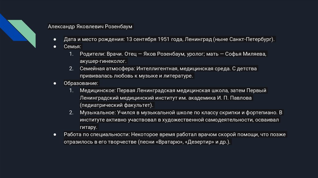 Александр Яковлевич РозенбаумДата и место рождения: 13 сентября 1951 года, Ленинград (ныне Санкт-Петербург).