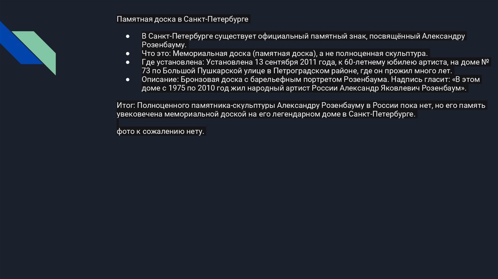 Итог: Полноценного памятника-скульптуры Александру Розенбауму в России пока нет, но его память