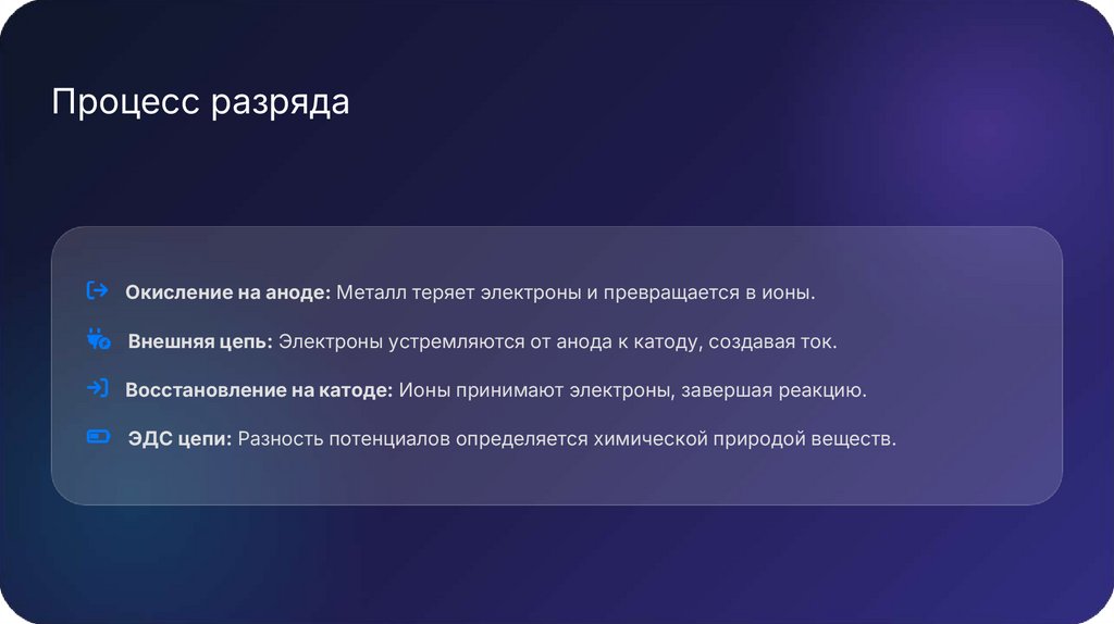 Процесс разрядаОкисление на аноде: Металл теряет электроны и превращается в ионы.