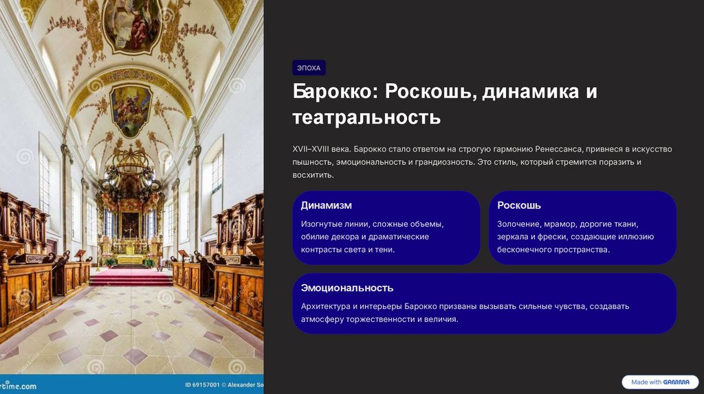 пышность, эмоциональность и грандиозность. Это стиль, который стремится поразить и
