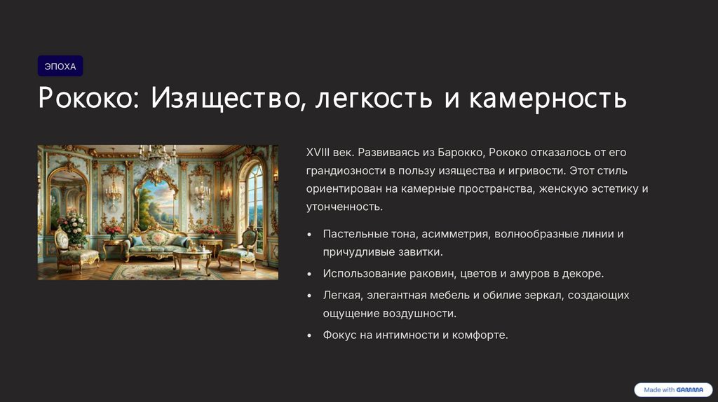XVIII век. Развиваясь из Барокко, Рококо отказалось от его