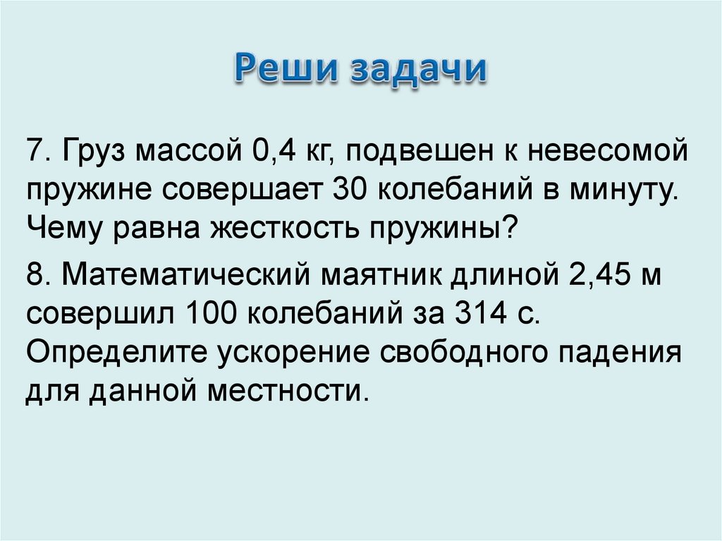 7. Груз массой 0,4 кг, подвешен к невесомойпружине совершает 30 колебаний в минуту.