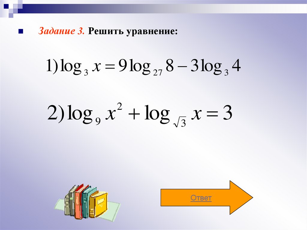Задание 3. Решить уравнение:1) log 3 x 9 log 27 8 3 log 3 4