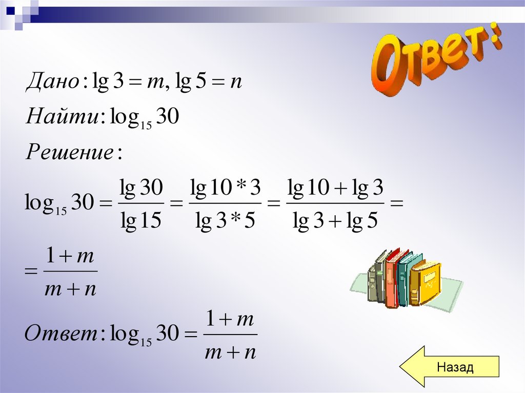 Дано : lg 3 m, lg 5 nНайти : log15 30