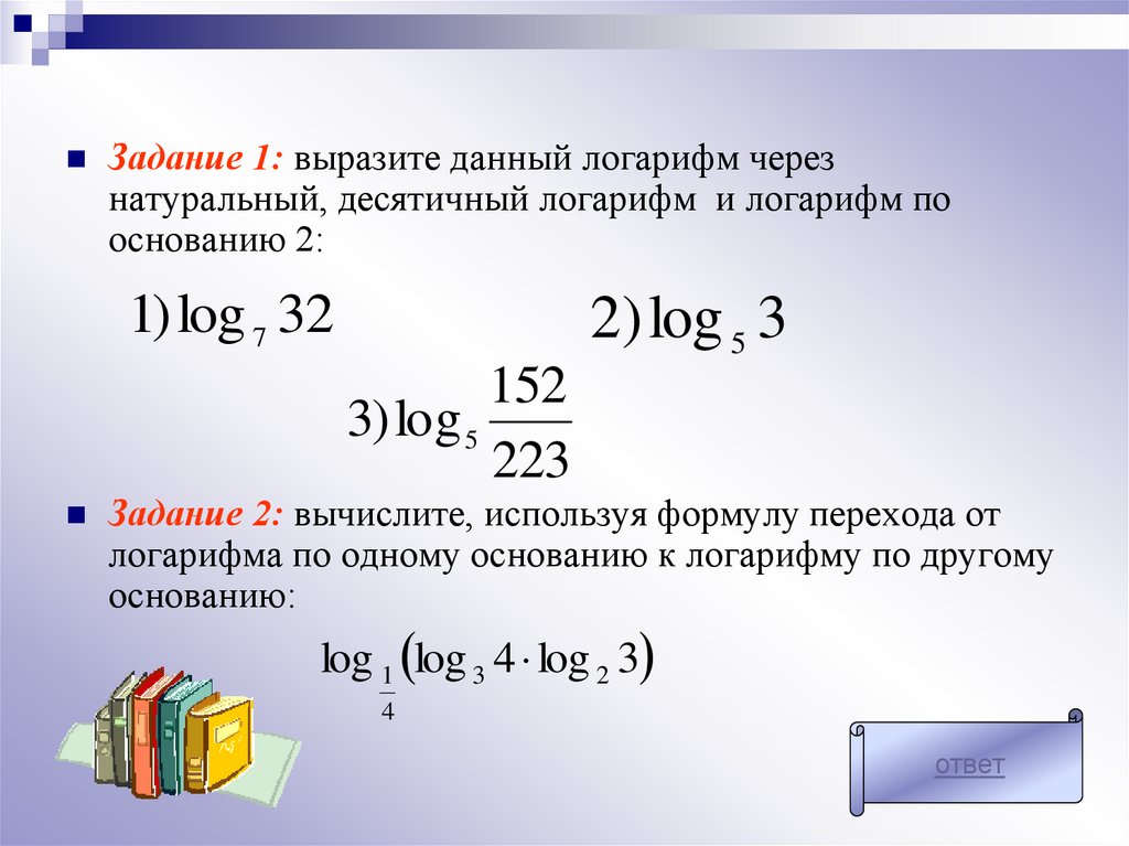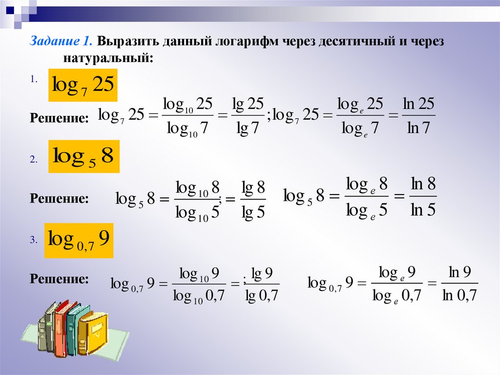 Задание 1. Выразить данный логарифм через десятичный и черезнатуральный: