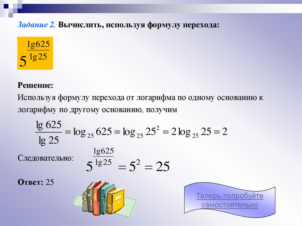 5. Формула перехода от одного основания логарифма к другому иногда используется при решении уравнений.