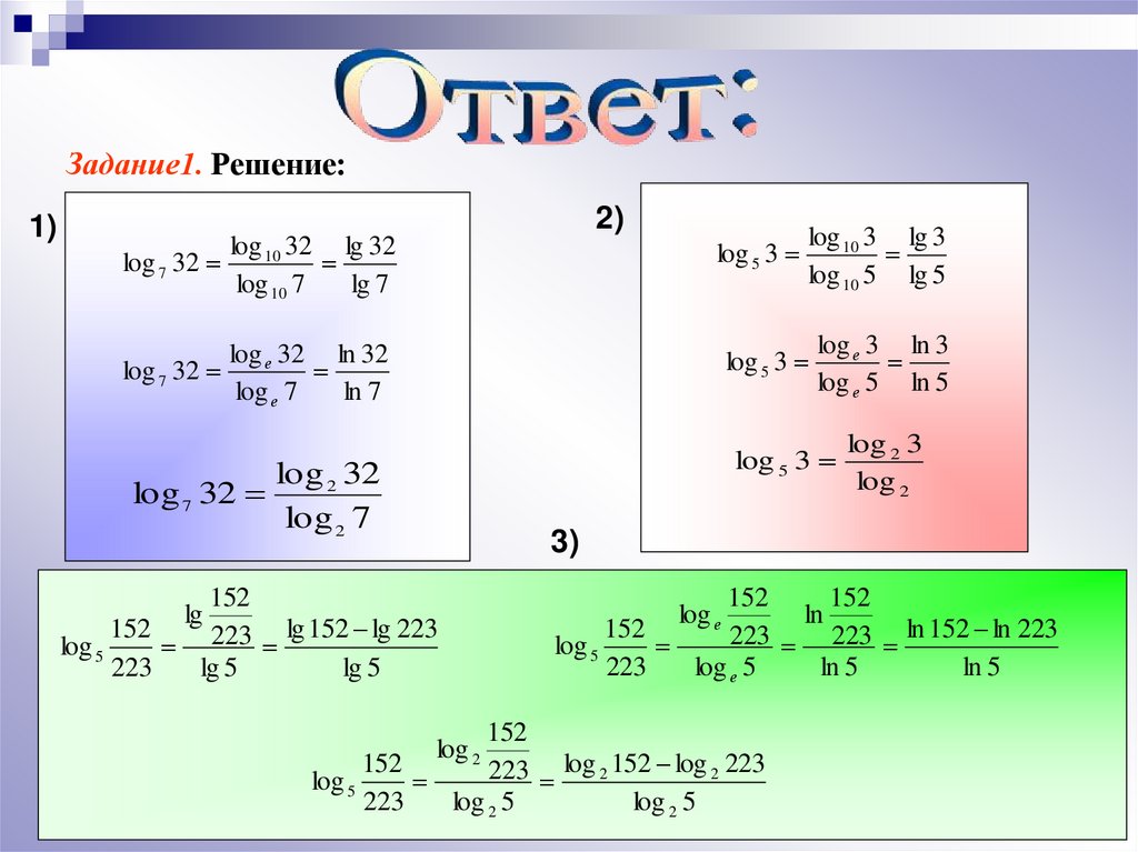 Задание 1: выразите данный логарифм черезнатуральный, десятичный логарифм и логарифм по