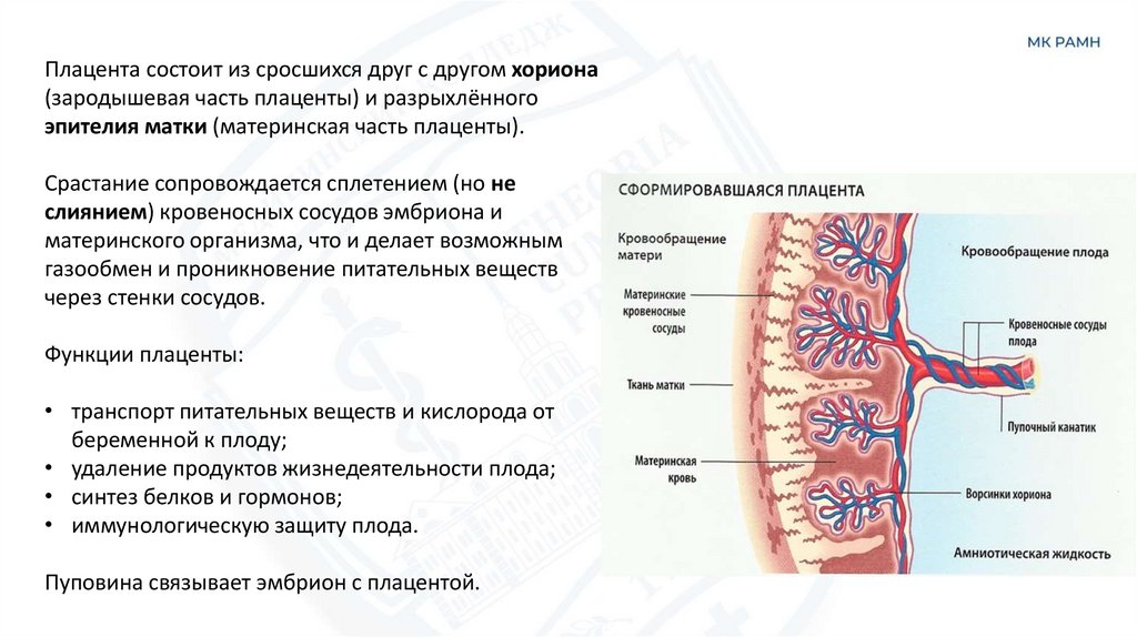 Плацента состоит из сросшихся друг с другом хориона(зародышевая часть плаценты) и разрыхлённого