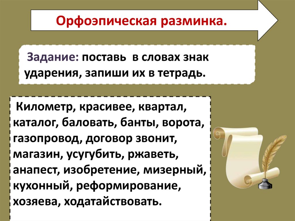 Орфоэпическая разминка.Задание: поставь в словах знак