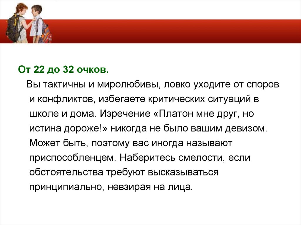 От 22 до 32 очков.Вы тактичны и миролюбивы, ловко уходите от споров