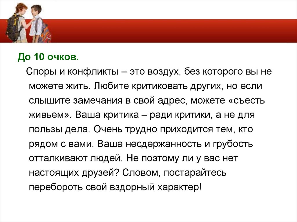 От 12 до 20 очков.Вы слывете человеком конфликтным. Но на самом