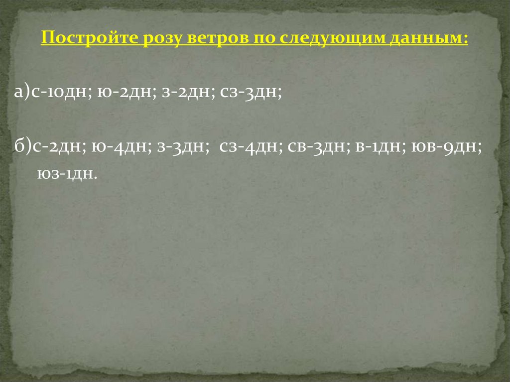 Постройте розу ветров по следующим данным:а)с-10дн; ю-2дн; з-2дн; сз-3дн;