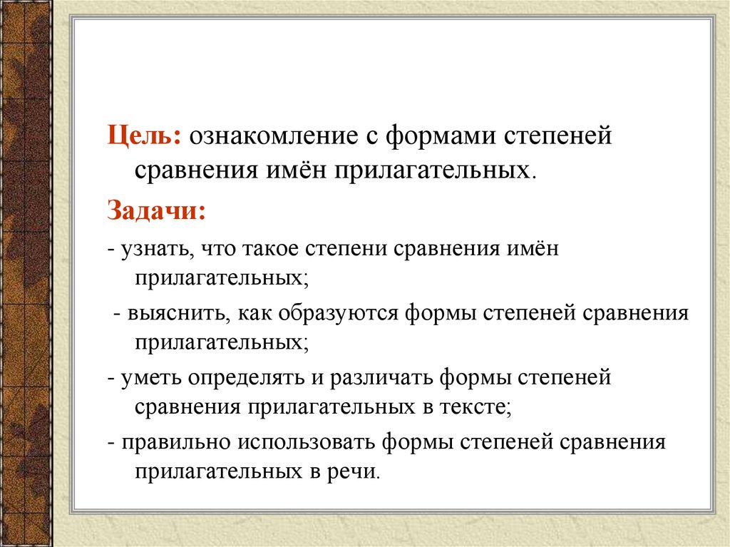 Цель: ознакомление с формами степенейсравнения имён прилагательных.