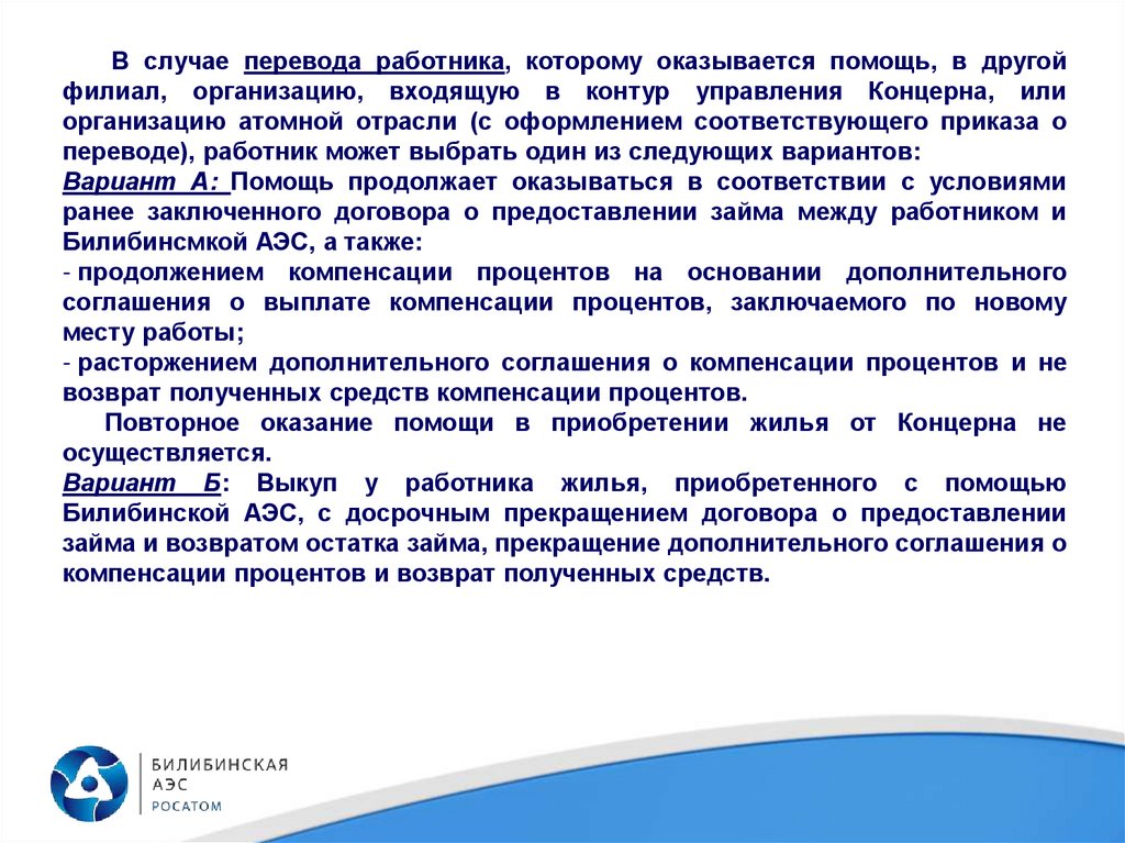 В случае перевода работника, которому оказывается помощь, в другойфилиал, организацию, входящую в контур управления Концерна, или