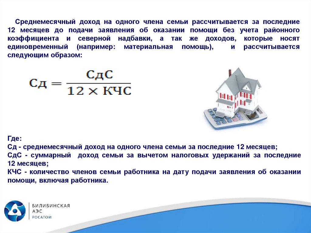 Среднемесячный доход на одного члена семьи рассчитывается за последние12 месяцев до подачи заявления об оказании помощи без учета районного