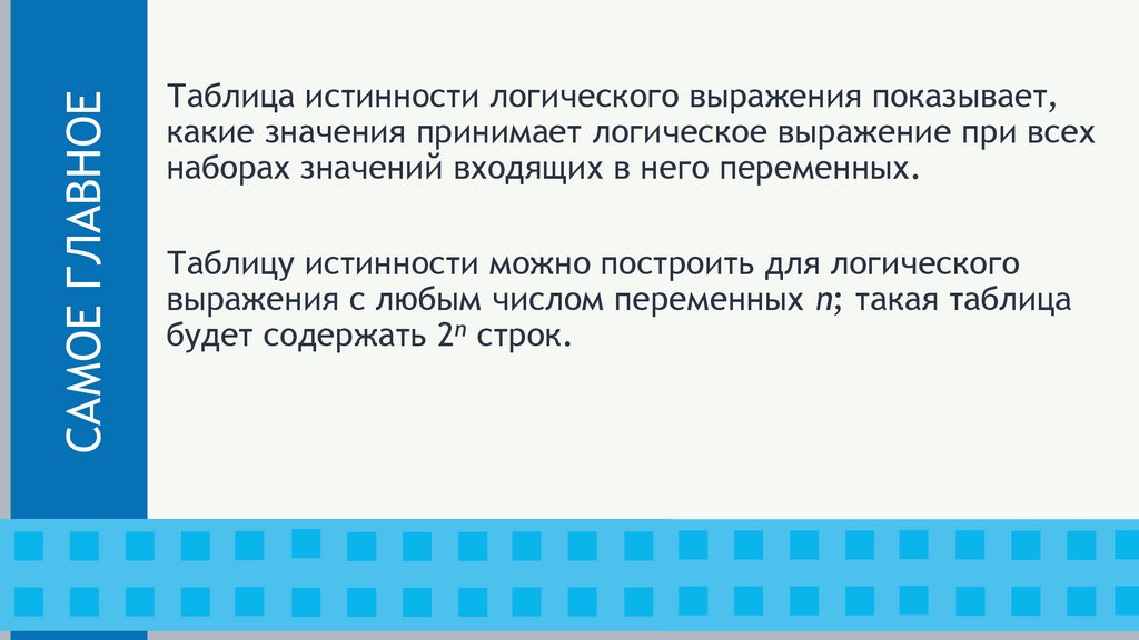 САМОЕ ГЛАВНОЕТаблица истинности логического выражения показывает,