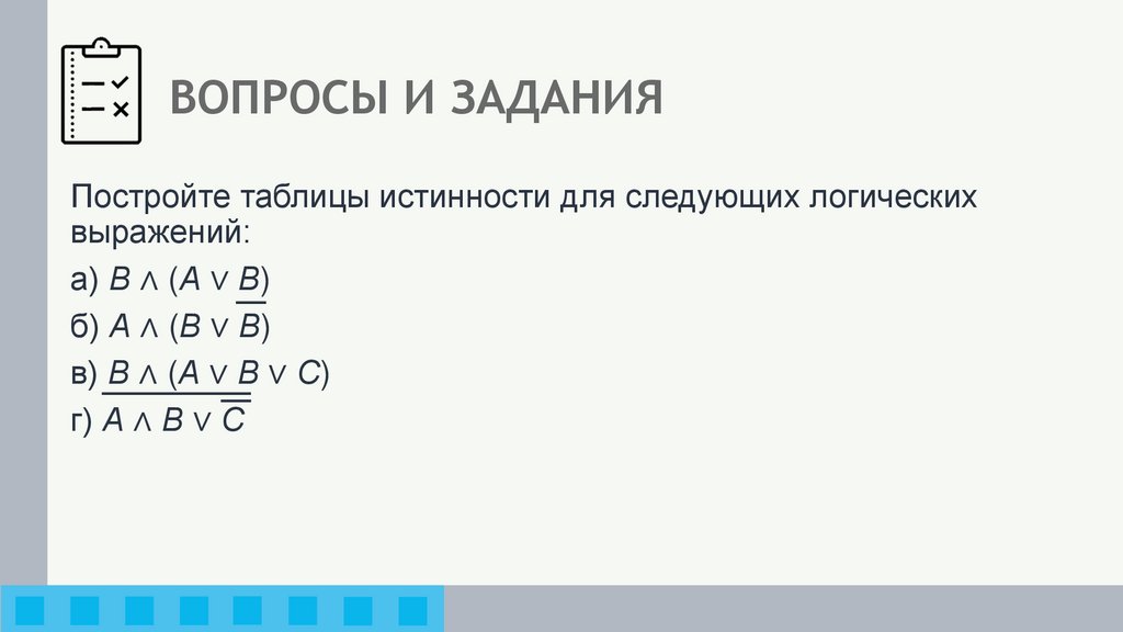 ВОПРОСЫ И ЗАДАНИЯПостройте таблицы истинности для следующих логических