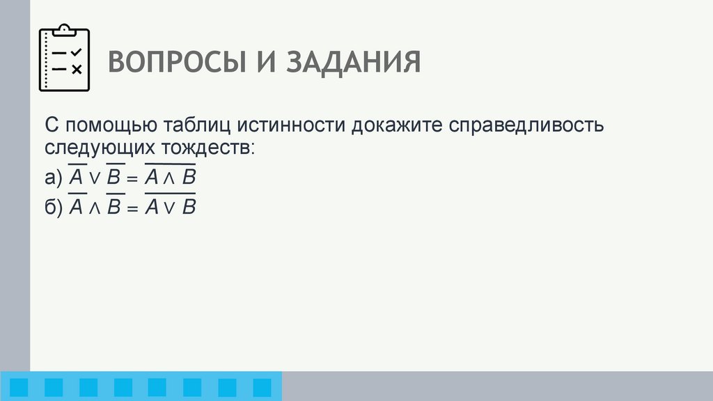 ВОПРОСЫ И ЗАДАНИЯС помощью таблиц истинности докажите справедливость