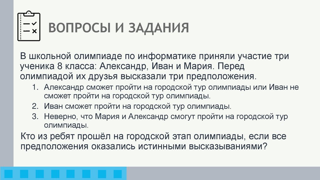 ВОПРОСЫ И ЗАДАНИЯВ школьной олимпиаде по информатике приняли участие три