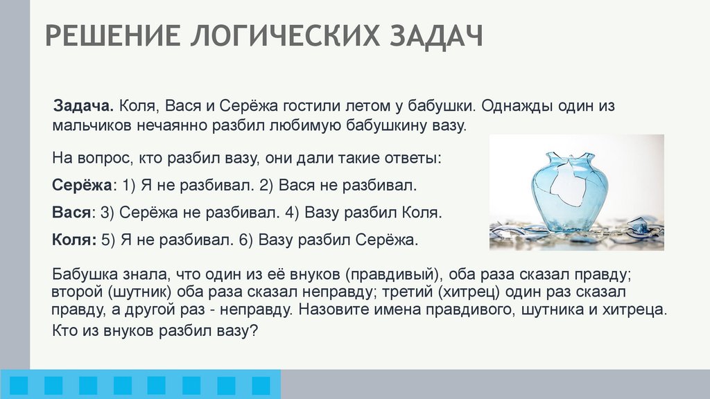 РЕШЕНИЕ ЛОГИЧЕСКИХ ЗАДАЧЗадача. Коля, Вася и Серёжа гостили летом у бабушки. Однажды один из