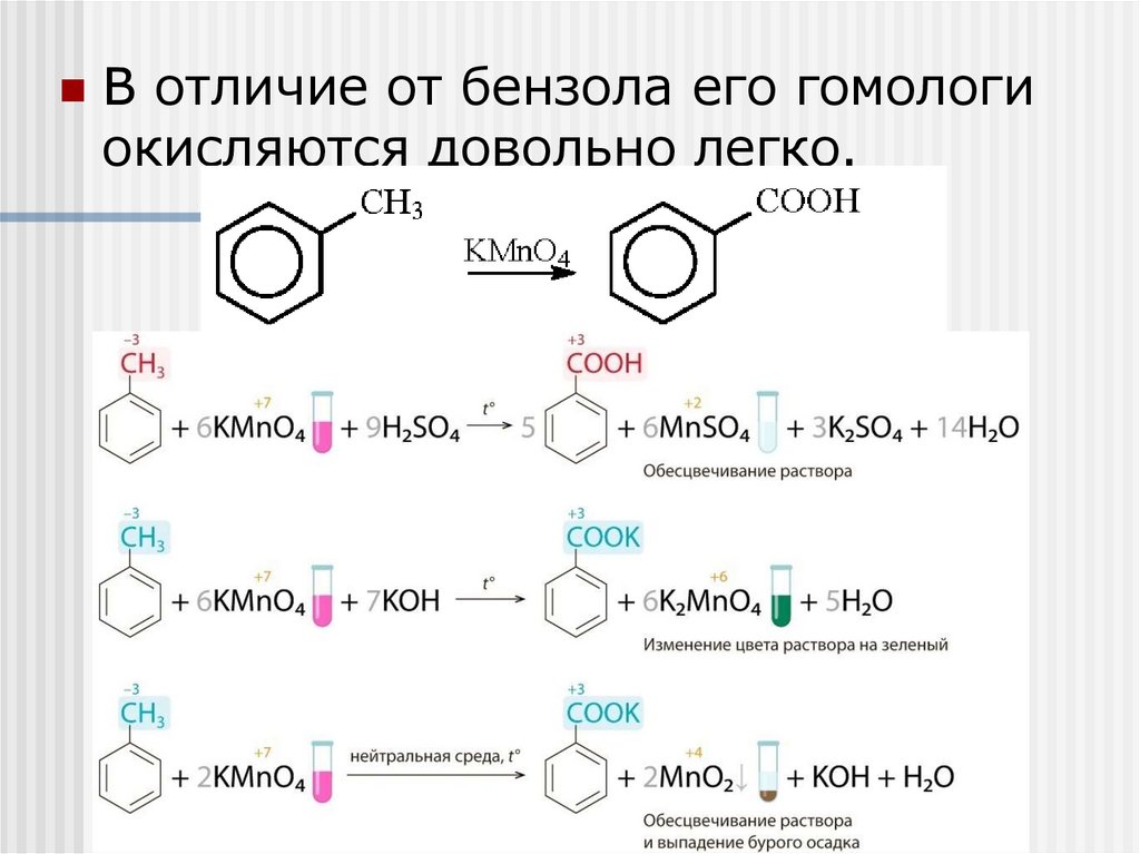 В отличие от бензола его гомологиокисляются довольно легко.