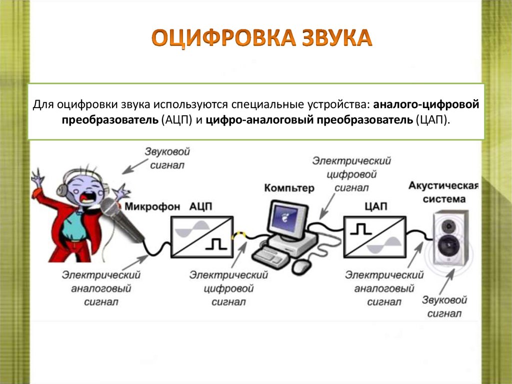 Для оцифровки звука используются специальные устройства: аналого-цифровойпреобразователь (АЦП) и цифро-аналоговый преобразователь (ЦАП).