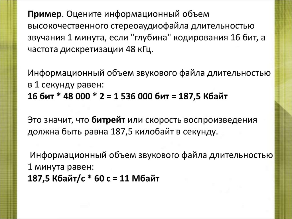 Пример. Оцените информационный объемвысокочественного стереоаудиофайла длительностью