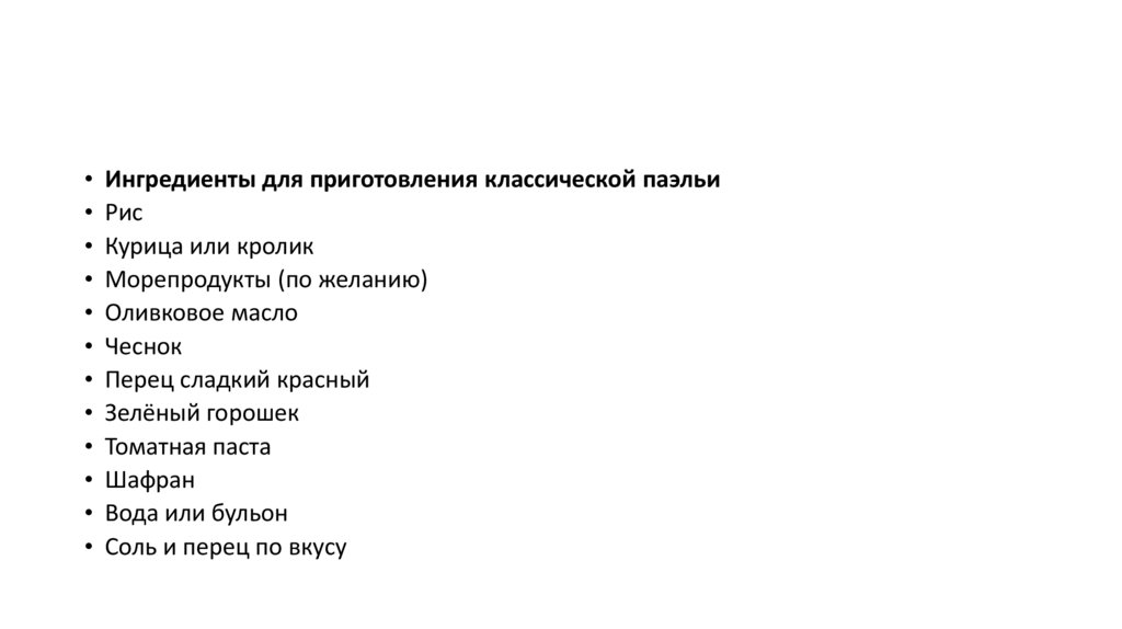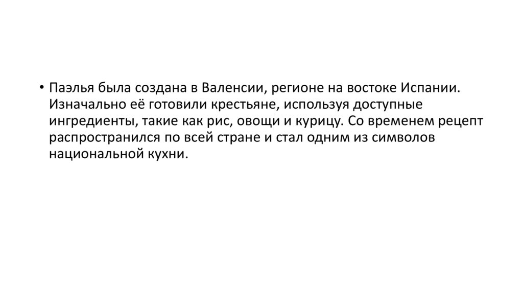 • Паэлья была создана в Валенсии, регионе на востоке Испании.Изначально её готовили крестьяне, используя доступные